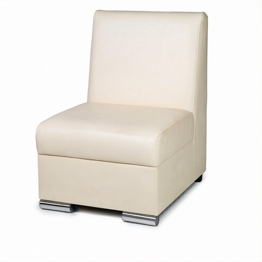 Опоры диван-кресла хромированные. Модель не снабжается раскладным механизмом, что делает ее компактной и удобной для небольших помещений.