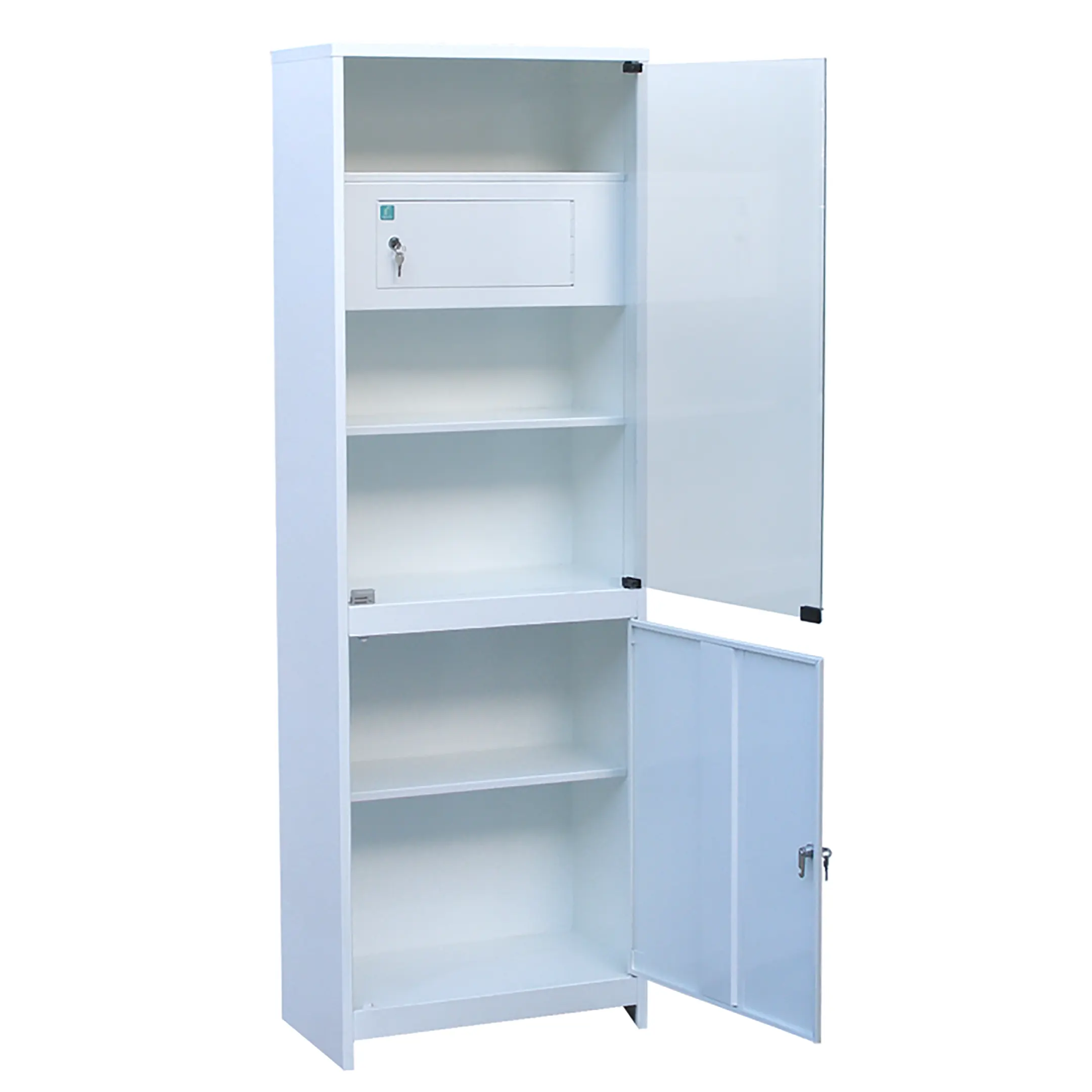 - запираемая металлическая дверь и одна стационарная металлическая полка - в нижнем отделении;