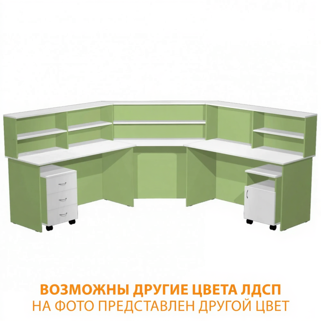 - Функциональная угловая конструкция — левый стол с надстройкой из двух отделений (левое отделение с горизонтальной полкой) и подкатной тумбой на 3 выдвижных ящика; правый стол с надстройкой из двух отделений (правое отделение с горизонтальной полкой) и подкатной тумбой с нишей и дверкой; угловой столик с надстройкой и горизонтальной полкой.
