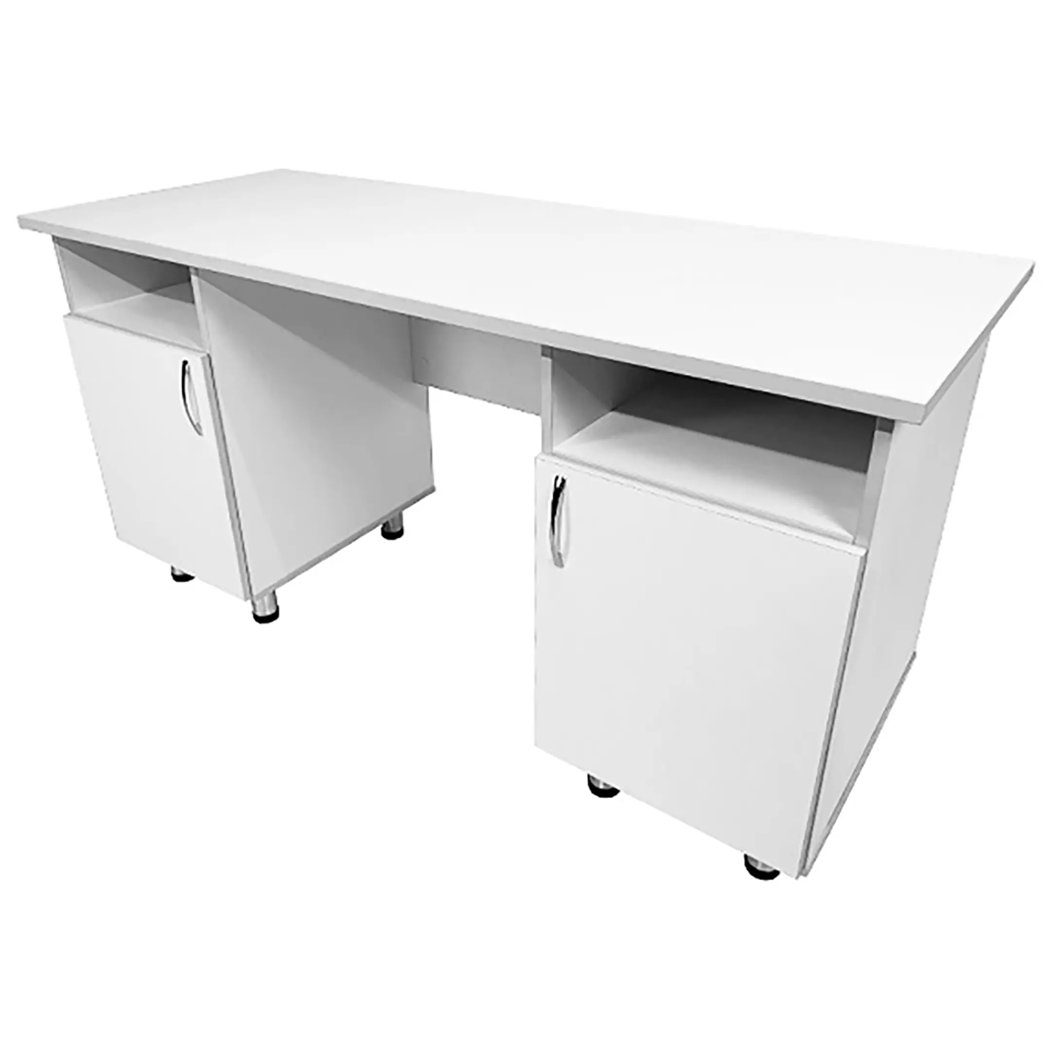 • Этот стол оборудован двумя боковыми тумбами, каждая из которых имеет нишу и отдел с дверкой и полкой внутри, обеспечивая удобное хранение необходимых материалов и инструментов. Дизайн выполнен в белом цвете ЛДСП с кромкой светло-серого оттенка, придавая изделию современный и профессиональный вид.