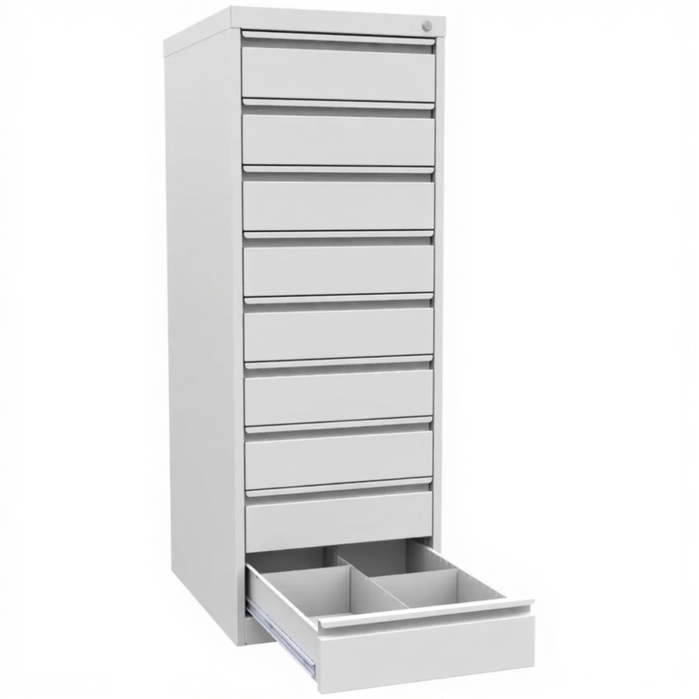 - Прочная и долговечная конструкция — шкаф изготовлен из качественной стали с порошковым покрытием. Направляющие ящиков рассчитаны на многократное использование. Классический дизайн и нейтральный цвет позволяют легко вписать шкаф в интерьер библиотеки, лаборатории или офиса.