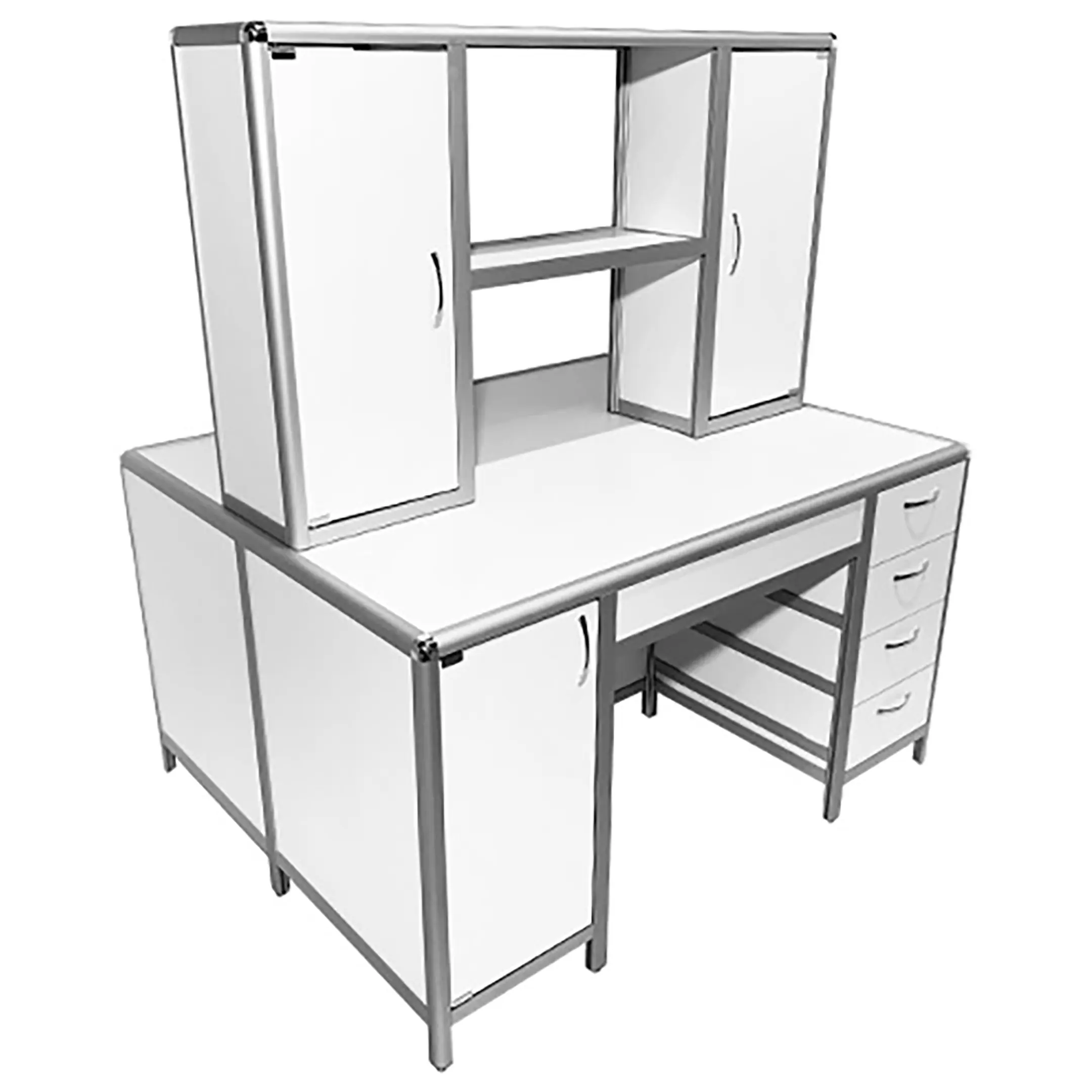 Стол лабораторный островной MED 11.004al с надстройкой (белый) — это идеальное решение для создания двух рабочих мест в лабораториях и медицинских учреждениях, обеспечивая оптимальное использование доступного пространства помещения. Модель оснащена двумя рабочими местами, каждое с двумя тумбами: одна с распашной дверкой и полкой, вторая с четырьмя выдвижными ящиками. Надстройка разделяет рабочее пространство на два сегмента. Каркас выполнен из алюминиевого профиля, столешница из ЛДСП толщиной 22 мм.