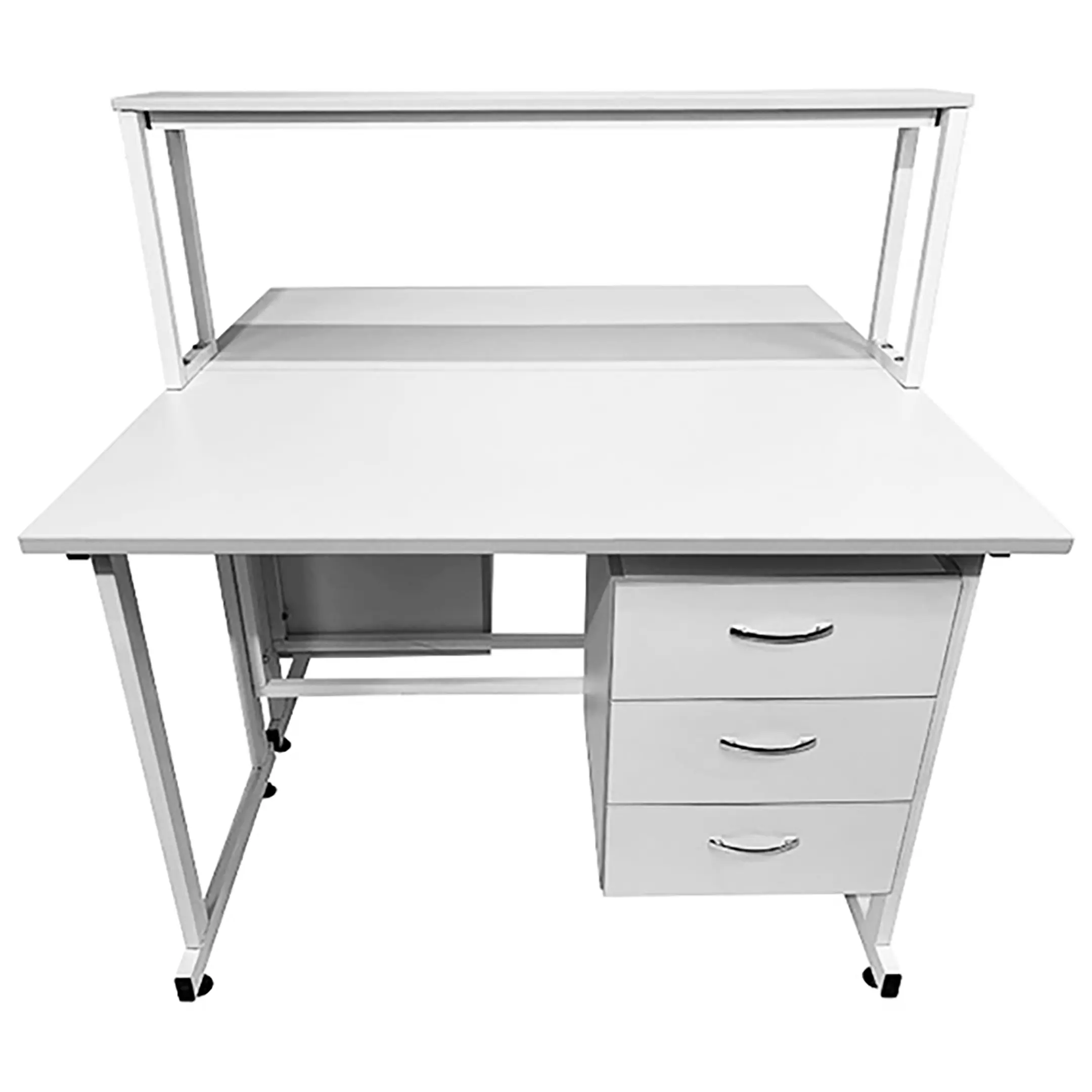 Стол лабораторный островной с надстройкой Сло 22.009 (белый) — это функциональное решение для организации двух независимых рабочих мест в лабораториях и медицинских учреждениях. Модель оснащена двумя рабочими местами, каждое с подвесной тумбой с тремя выдвижными ящиками, и центральной надстройкой с одной полкой. Каркас выполнен из стального профиля, столешницы из ЛДСП толщиной 22 мм.