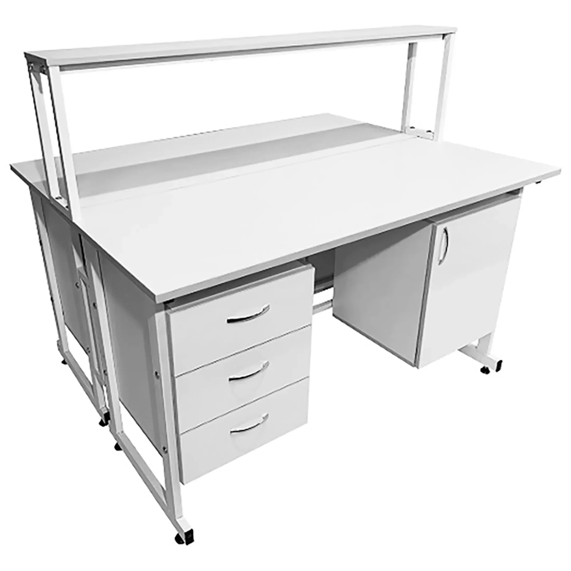Стол лабораторный островной с надстройкой Сло 22.012 (белый) создан для удобной организации двух рабочих мест, идеально подходящих для лабораторий или медицинских учреждений. Благодаря его продуманным конструктивным особенностям, максимально рационально используются свободные пространства помещения. Модель оснащена двумя рабочими местами, каждое с двумя подвесными тумбами: слева с тремя выдвижными ящиками, справа с распашной дверкой и полкой, а также центральной надстройкой с одной полкой. Каркас выполнен из стального профиля, столешницы из ЛДСП толщиной 22 мм.