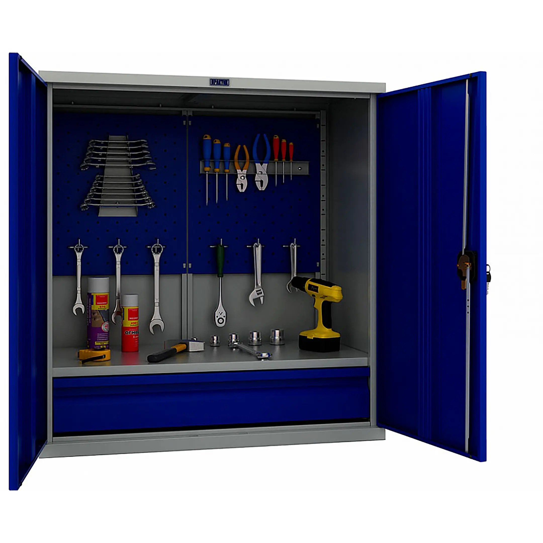 - Надежная защита инструментального парка — цельнометаллический корпус с запирающимися на общий замок дверями обеспечивает высокий уровень безопасности. Это защищает содержимое от краж, несанкционированного доступа, а также от пыли, грязи, стружки и влаги, характерных для производственной среды.