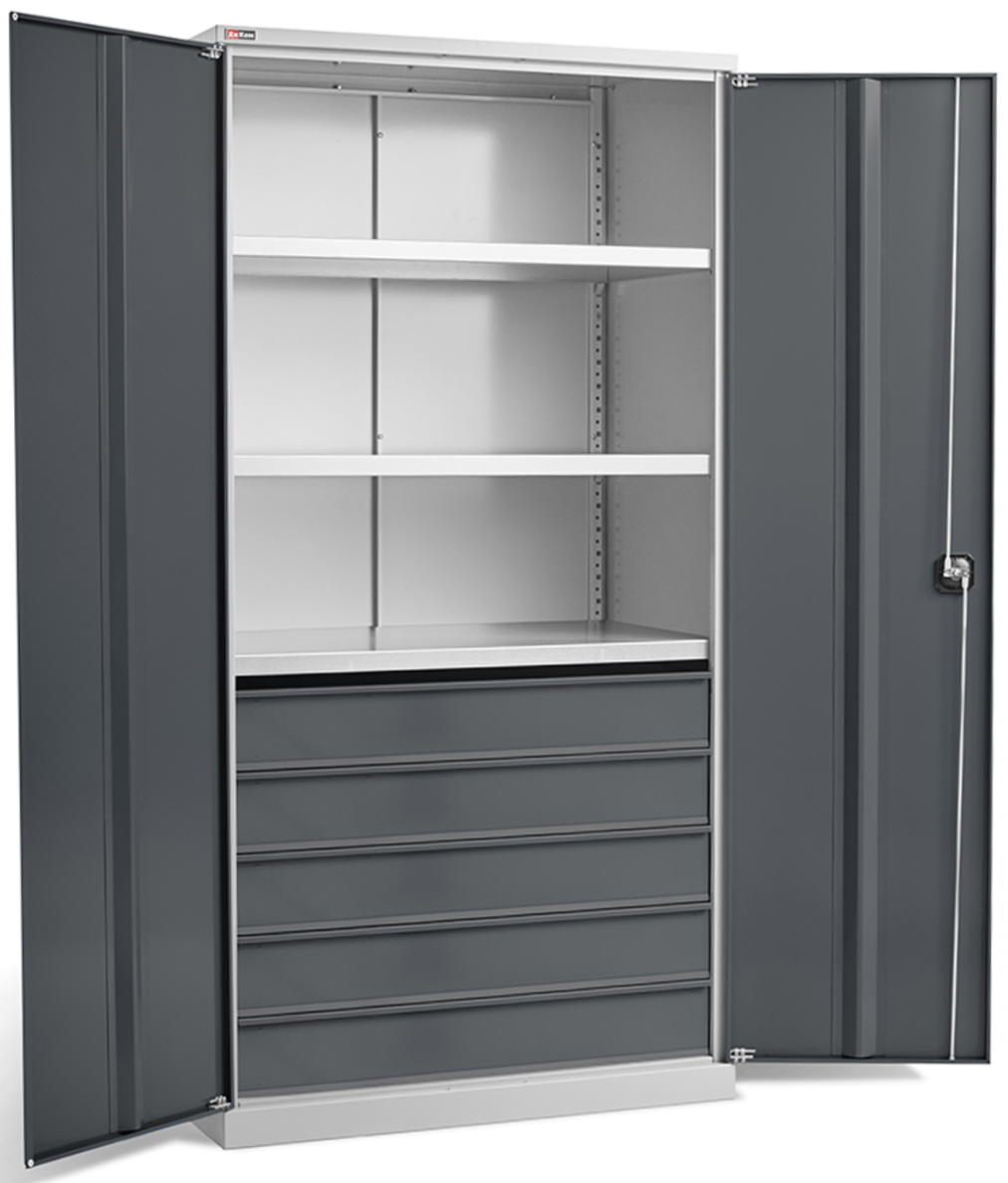 - Прочность и долговечность — шкаф изготовлен из качественной стали и покрыт износостойкой порошковой краской, устойчивой к механическим воздействиям, царапинам и условиям, типичным для мастерских. Конструкция рассчитана на длительный срок службы при активной эксплуатации.