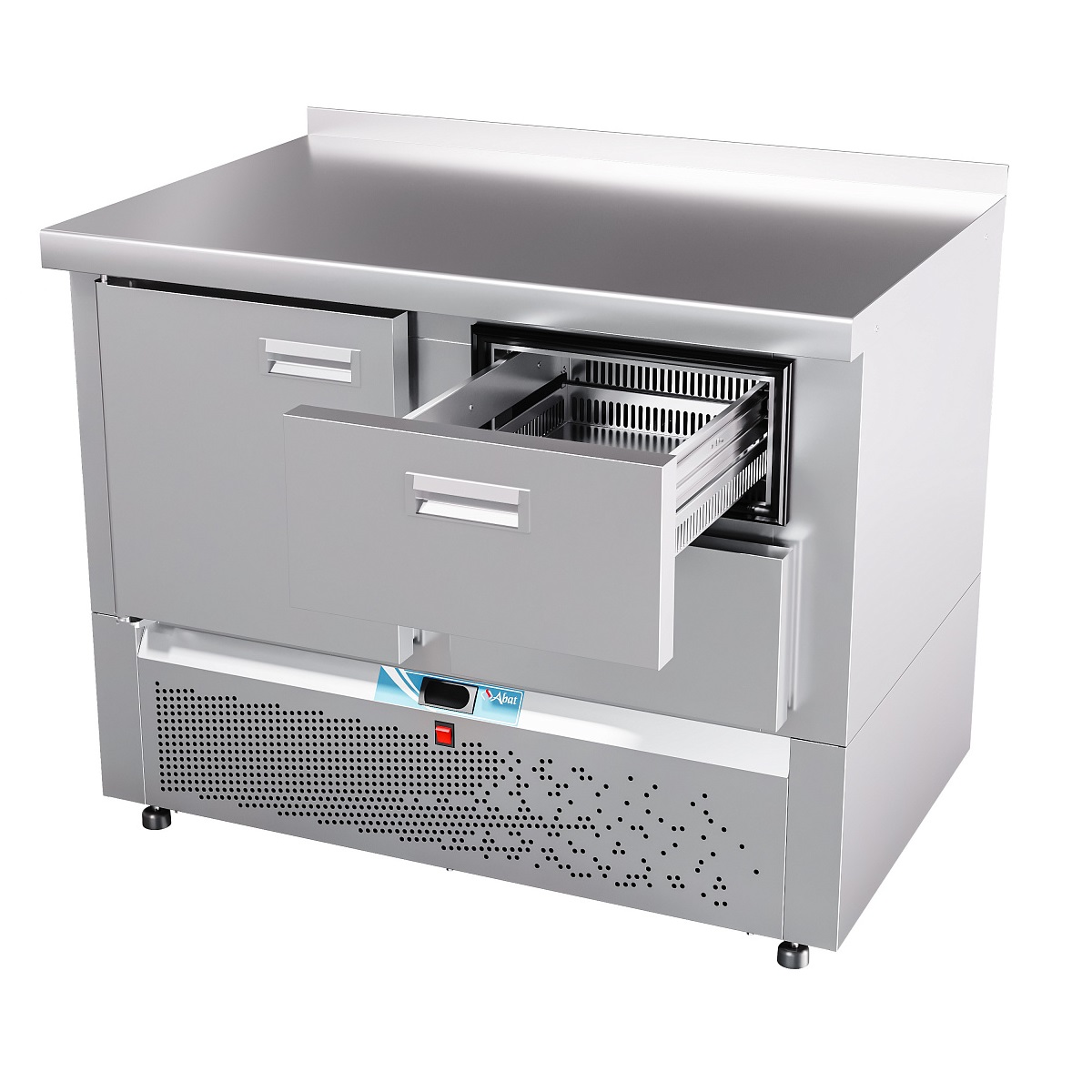 Особенности Электронная панель управления; потребление электроэнергии за сутки, кВт*ч, не более 3,36; климатический класс изделия - 5; поверхность стола - ровная неохлаждаемая поверхность без борта; толщина стенок 60 мм; холодильный агрегат расположен снизу, выдвижной для удобства обслуживания; хладагент - R404a; электронный блок управления с возможностью регулирования и поддерживания необходимой температуры; динамическое охлаждение - воздухоохладитель с вентилятором для равномерного распределение температуры внутри полезного объема; работа при температуре окружающей среды до +42 °C, относительной влажности от 40 до 70%; цельнозаливной пенополиуретаном корпус; автоматическая оттайка; 2 секции - дверь и ящики 1/2; одна регулируемая по высоте полка-решетка размером GN 1/1; уплотнитель с магнитной вставкой на двери для обеспечения полной теплоизоляци; передняя и задняя стенки легкосъемные; регулируемые по высоте ножки, которые могут опционально быть заменены на колеса (2 со стопором, 2 без стопора) без изменения высоты стола. Описание Стол холодильный низкотемпературный с нижним расположением агрегата предназначен для кратковременного хранения пищевых продуктов на предприятиях общественного питания и торговли. Рациональное использование рабочего пространства кухни за счет совмещения в одном изделии функции холодильногошкафа и рабочего стола.