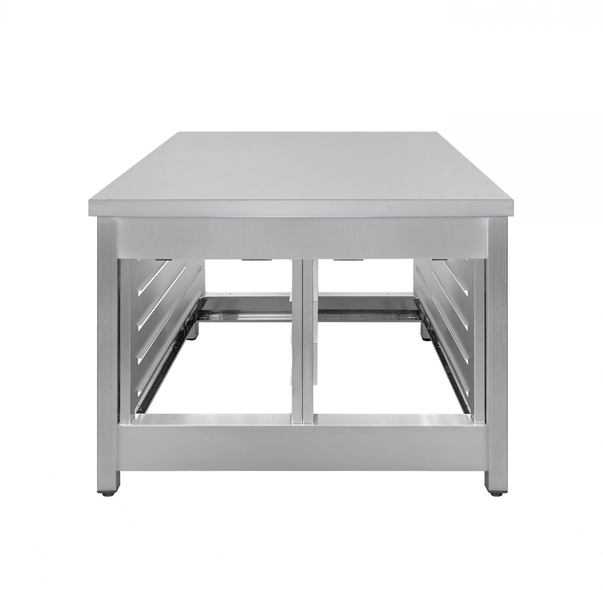 Держатели снизу используют для размещения гастроемкостей и пекарских листов. Ножки регулируются по высоте для компенсации неровностей пола.