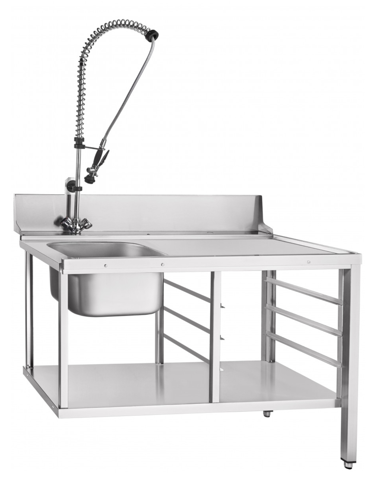 Стол модели СПМП-6-3 условно разделен на две зоны. Первая — это рабочая поверхность для складирования посуды. В ее нижней части предусмотрены направляющие для четырех кассет размером 500х500 мм. Вторая зона состоит из цельнотянутой мойки с душирующим устройством, где посуду предварительно обрабатывают. Объединяет обе зоны функциональная нижняя полка. Используют ее для выкладки посуды и инвентаря, а также хранения моющих средств и текстиля.