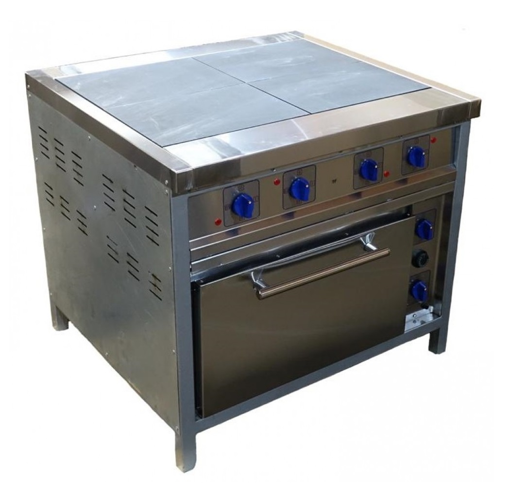 Электрическая четырехконфорочная плита с жарочным шкафом. Предназначена для приготовления различных блюд в наплитной посуде, противнях и решетках на предприятиях общественного питания и торговли. Модель оснащена ступенчатым регулированием температуры и регулируемыми по высоте ножками.