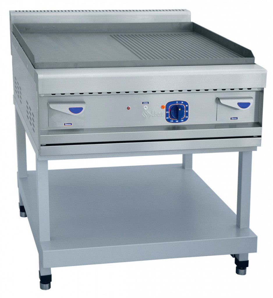 - Комбинированная стальная рабочая поверхность — размером 834х703 мм (1/2 гладкая, 1/2 рифленая), позволяет выбирать тип обработки в зависимости от продукта.