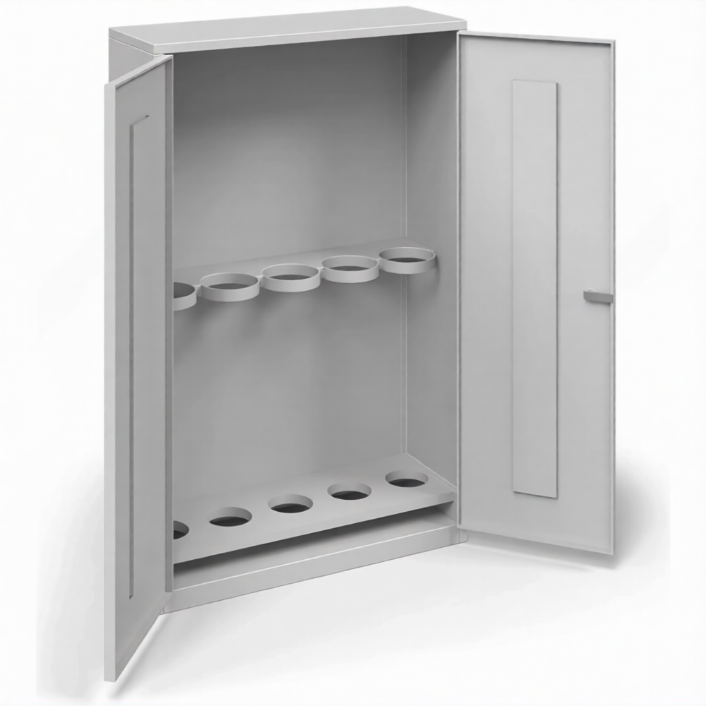 - Специализация для кислорода и баллонов малой емкости — шкаф предназначен именно для безопасного хранения кислородных баллонов объемом 10 литров. Его внутренние размеры и конфигурация рассчитаны на компактное и удобное размещение пяти таких баллонов, что оптимально для медицинских кабинетов, небольших сварочных постов или лабораторий, где не требуются большие 40-литровые емкости.