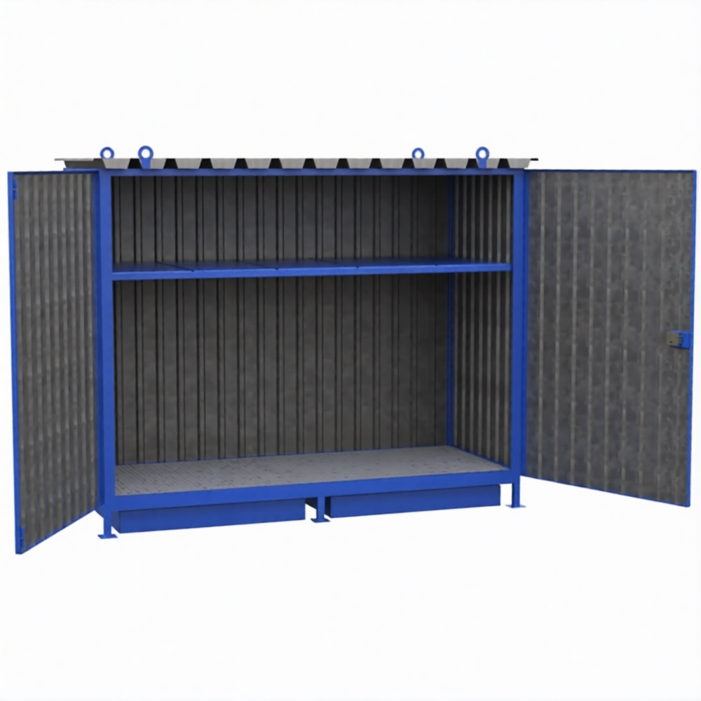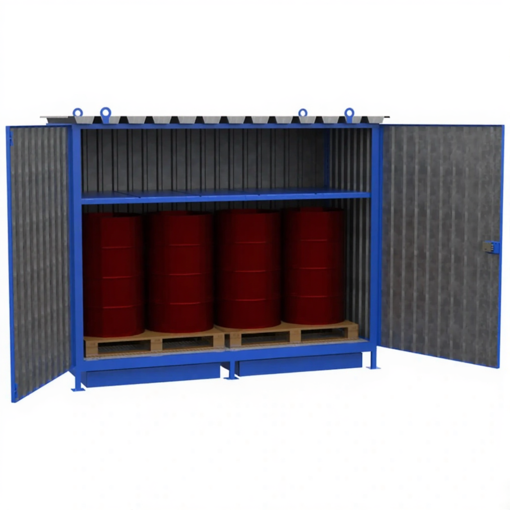 Шкаф для хранения 8-ми бочек 2148x2679x1117, металлический настил, сточный поддон — это вместительное и профессиональное решение для безопасного и организованного хранения бочек с жидкостями или сыпучими материалами на промышленных объектах, складах и в логистических зонах. Модель с габаритами 2148x2679x1117 мм представляет собой крупный металлический шкаф-навес, рассчитанный на 8 стандартных бочек, и оснащенный обязательными элементами безопасности: металлическим настилом для доступа и сточным поддоном для локализации аварийных разливов.