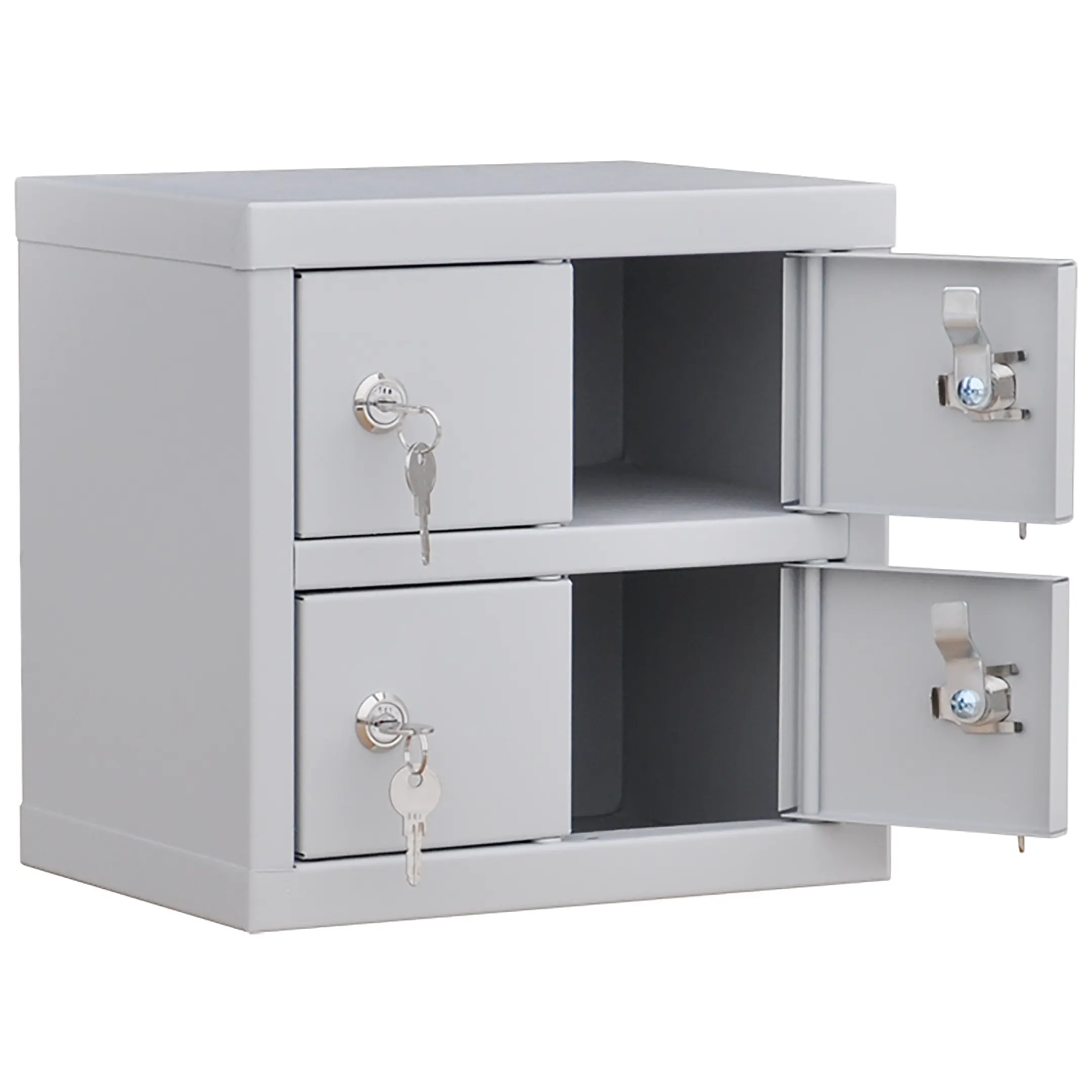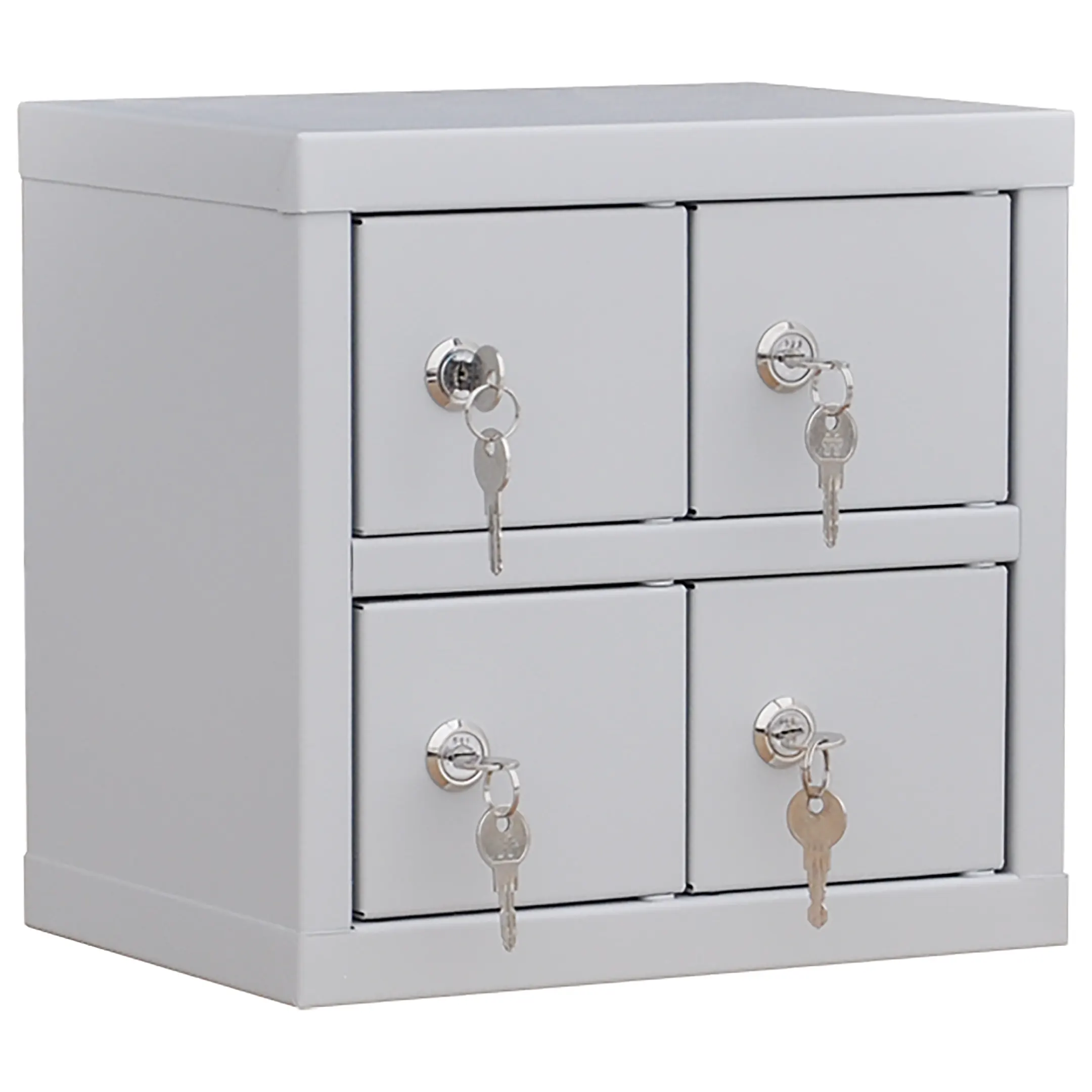 - Минимальные габариты для максимальной экономии пространства — шкаф занимает крайне мало места, предоставляя при этом 4 индивидуальные запирающиеся ячейки. Его можно разместить на любом свободном углу стола, полке, прилавке или в сейфе, не нарушая эргономику рабочего места.