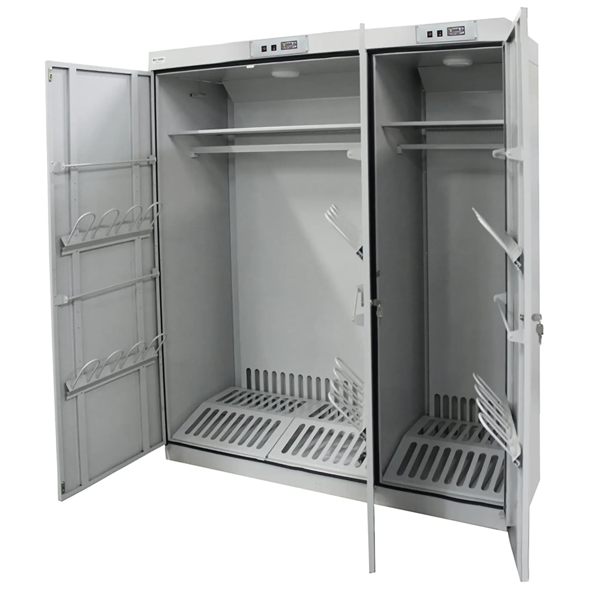 - Многофункциональность и универсальность — наличие дополнительной штанги позволяет сушить одежду на плечиках, что предотвращает образование заломов и сохраняет ее форму, в то время как полки предназначены для обуви, головных уборов, снаряжения или сложенной одежды. Это делает шкаф универсальным решением для комплексной обработки рабочей и спортивной формы.